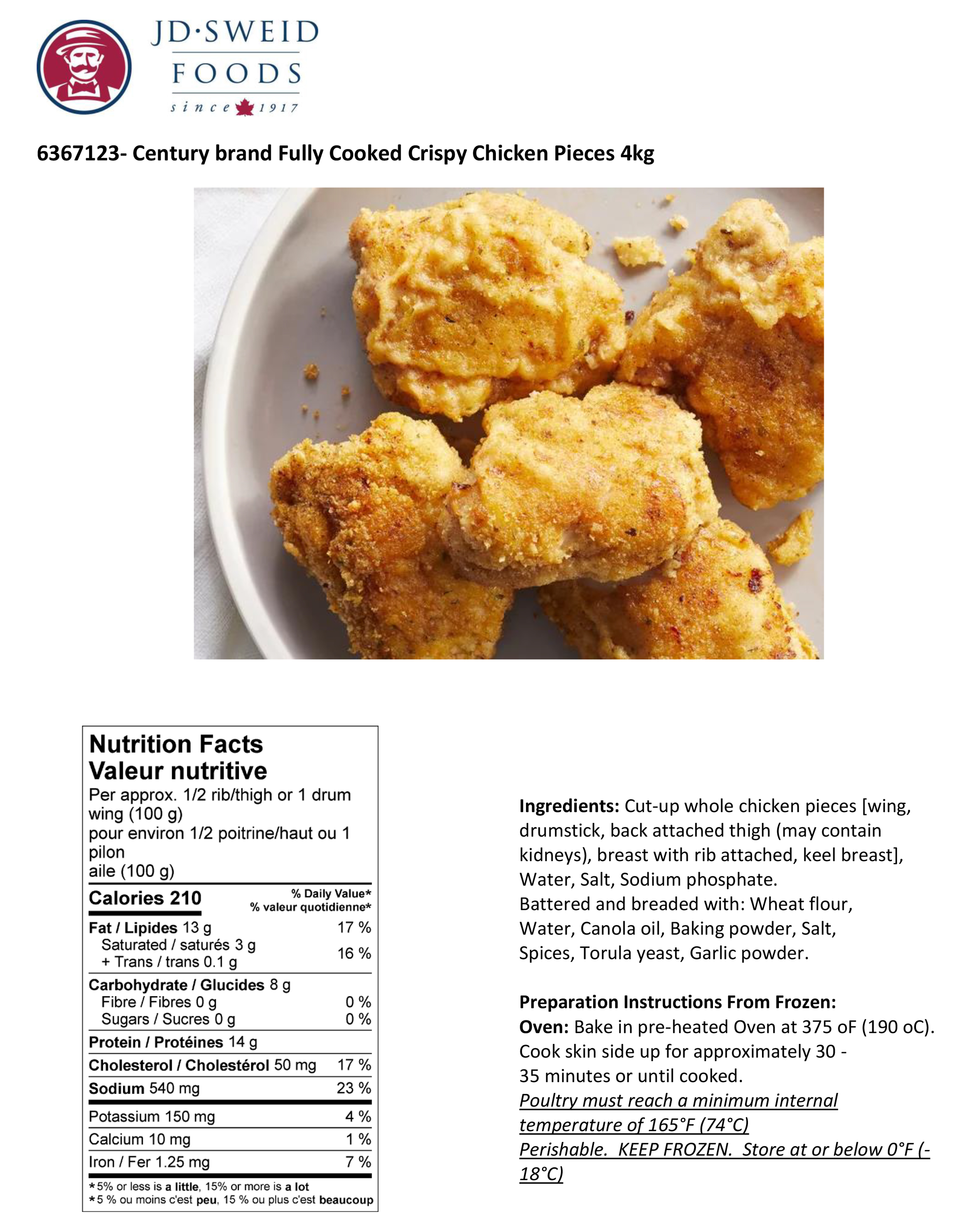 - Cooking Instructions: Fry at 375F for 9-11 minutes, or until an internal temperature of 165F. Bake at 400F for 20-25 minutes, or until an internal temperature of 165F.
